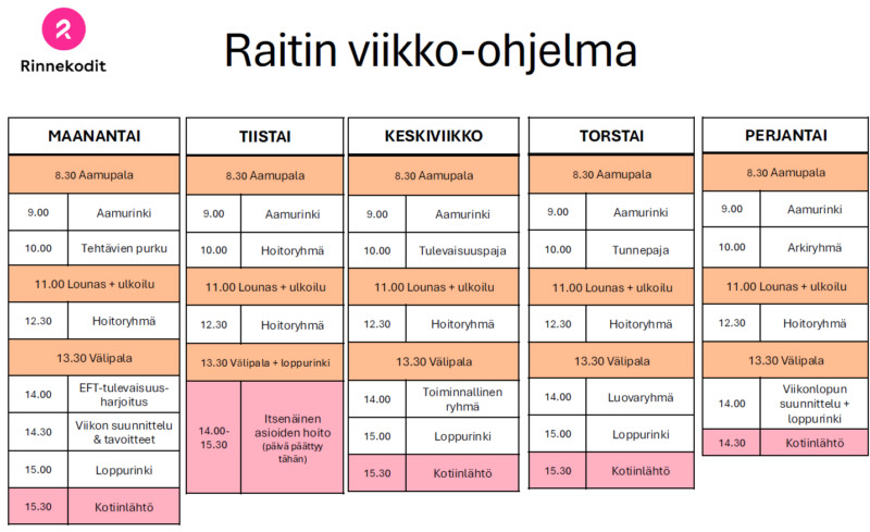 Ryhmä on tarkoitettu Raitin avokuntoutuksen käyneille ja osallistuminen on vapaaehtoista/avointa. Voit käydä kertaluontoisesti tai oman kiinnostuksen mukaan vaikka kuukausittain. Ryhmä on päihteetön.